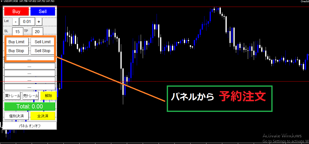 この、「ワンクリックオーダーパネル」は、チャートから直感的にエントリーや、決済が行えるスグレモノ👍