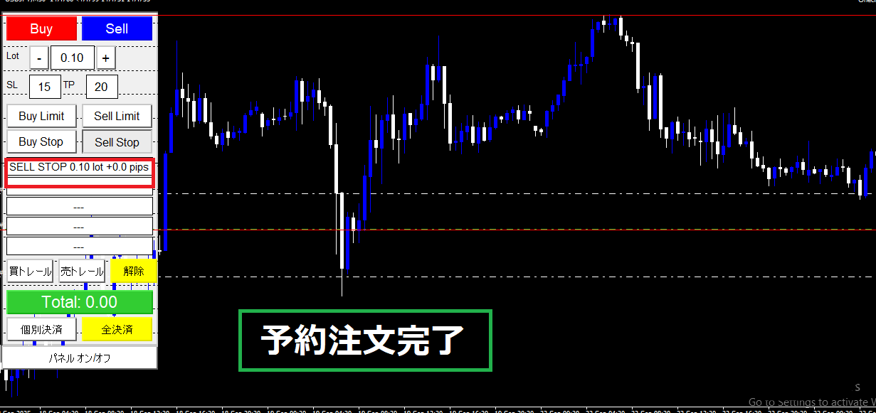 ライトれFxの条件に従いチャートにラインを引き、Slell Stopや、Buy Stopをパネルから注文